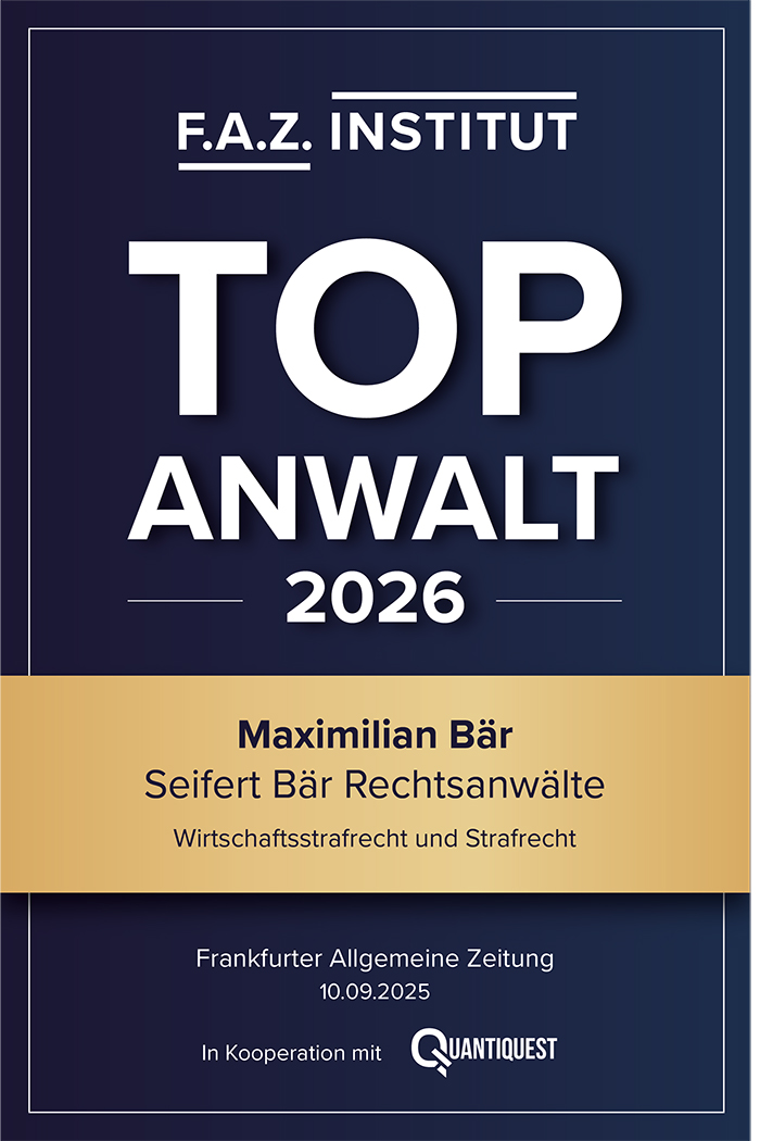 Seifert Bär Rechtsanwälte wurde vom Handelsblatt im Ranking „Deutschlands beste Kanzleien 2024 und 2025“ in der Kategorie Wirtschaftsstrafrecht ausgezeichnet und zählt damit zu den führenden Kanzleien in Deutschland in diesem Bereich.